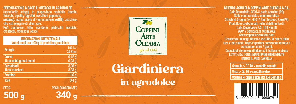Coppini Arte Olearia's Sweet and Sour Giardiniera is an artisanal delight prepared with a mix of fresh vegetables, cut entirely by hand to guarantee an authentic flavor and a crunchy texture. Each jar contains carrots, fennel, onions, green beans, cauliflower, peppers and celery, in a very balanced sweet and sour sauce .